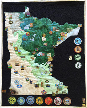 MN State Parks - Quilted image of the state of MN and it's various biomes with collected state park pins and patches. 18 x 24